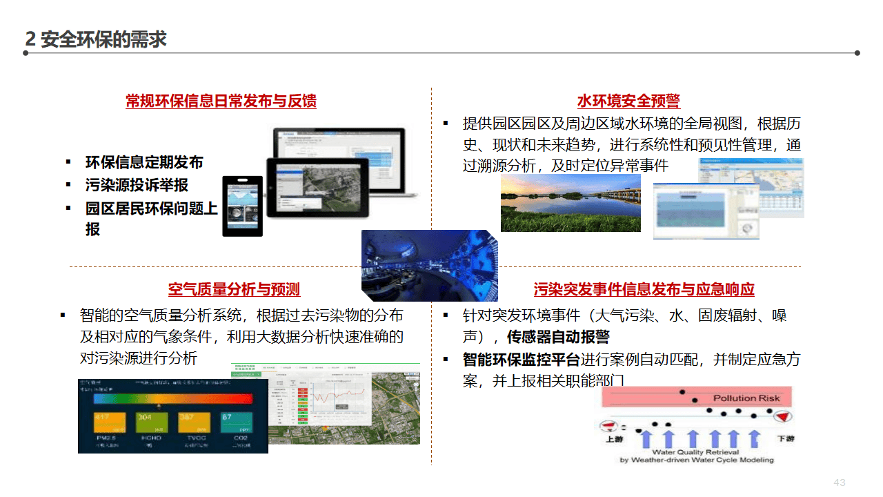 安全环保:空气质量分析与预测(基于大数据分析快速定位污染源)、水环境安全预警(溯源分析,及时定位异常事件)、污染突发事件自动报警和应急响应。