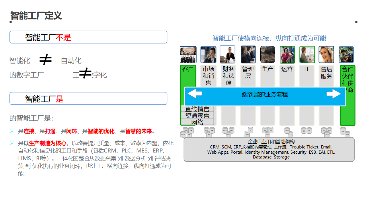 - 横向集成:从供应商到工厂到客户,整条价值链的端到端信息贯通;