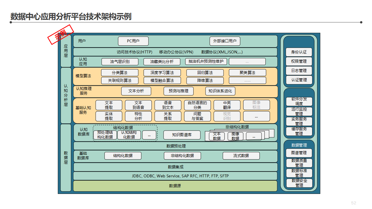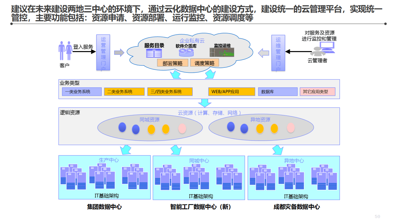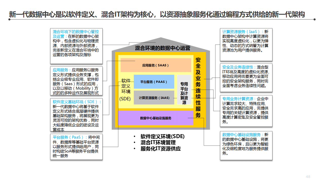 数据中心:承载企业所有IT系统的运行环境,是整个数字化体系的物理基础。数据中心的规划要考虑容量、可靠性、网络架构、安全体系。