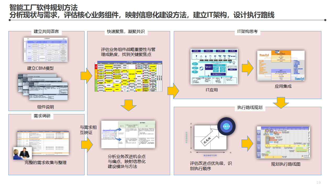 在此基础上,再做六个步骤:需求调研收集→建立CBM模型→评估业务组件战略重要性与管理成熟度→分析业务改进机会点→建立IT架构→规划执行路线。