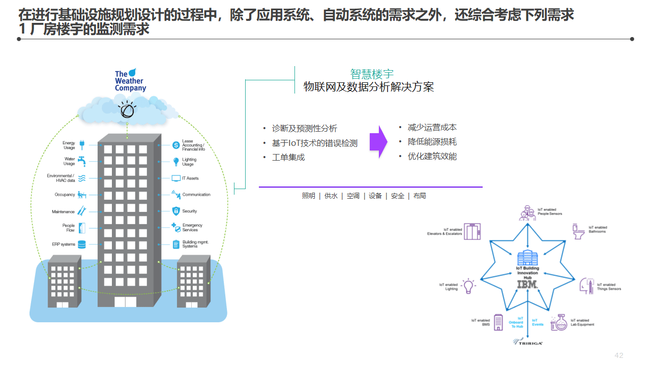 智慧楼宇(BA):智能空调和新风系统、智能照明、智能路灯、IoT终端全连接、特种设备管理、资产自动盘点。基于IoT技术的错误检测和预测性分析,能显著降低楼宇运营成本、减少能源损耗。