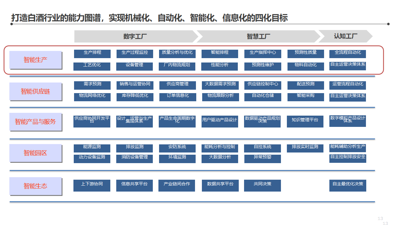 从数字工厂阶段的"生产排程+过程监控",到智慧工厂的"智能排程+预测性维护+生产指挥中心",再到认知工厂的"全流程自动化+自主运营决策体系",每一步都有清晰的能力边界。