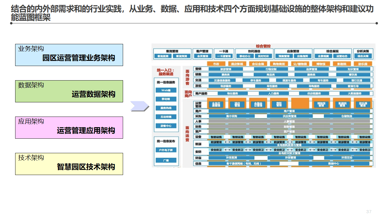 应用集成架构方面,视频监控系统、停车管理系统、入侵报警系统、门禁系统、访客系统、楼宇自控系统、能源管理系统、IoT资产管理RFID系统,全部通过统一运营平台和数据集成平台打通,向上提供APP/Web应用界面。