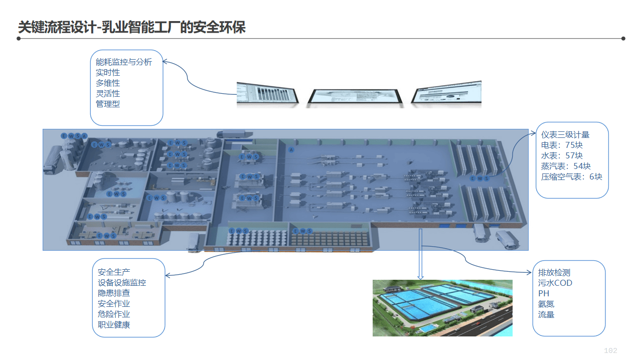 智慧能源:仪表三级计量(电表、水表、蒸汽表、压缩空气表),能耗实时监控,CO₂排放跟踪,水消耗管理,废物处置管理。能源监控的目的不只是合规,更是降本------精细化管理后,节能10%~15%是完全可期待的。