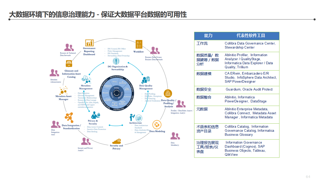 治理内容(横轴):数据架构、元数据、主数据、数据模型、数据标准、数据质量、数据生命周期、数据安全。这八个领域缺一不可。