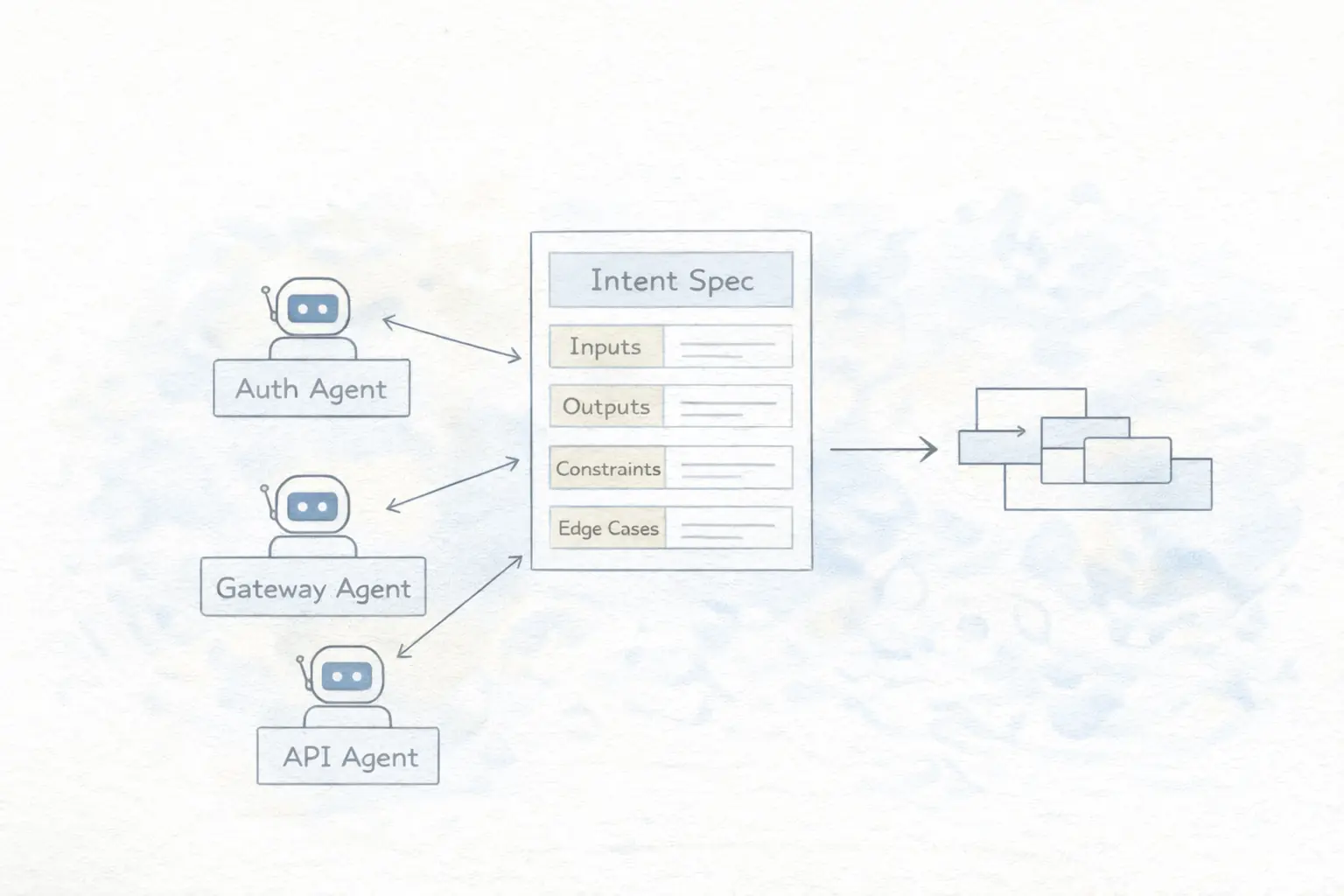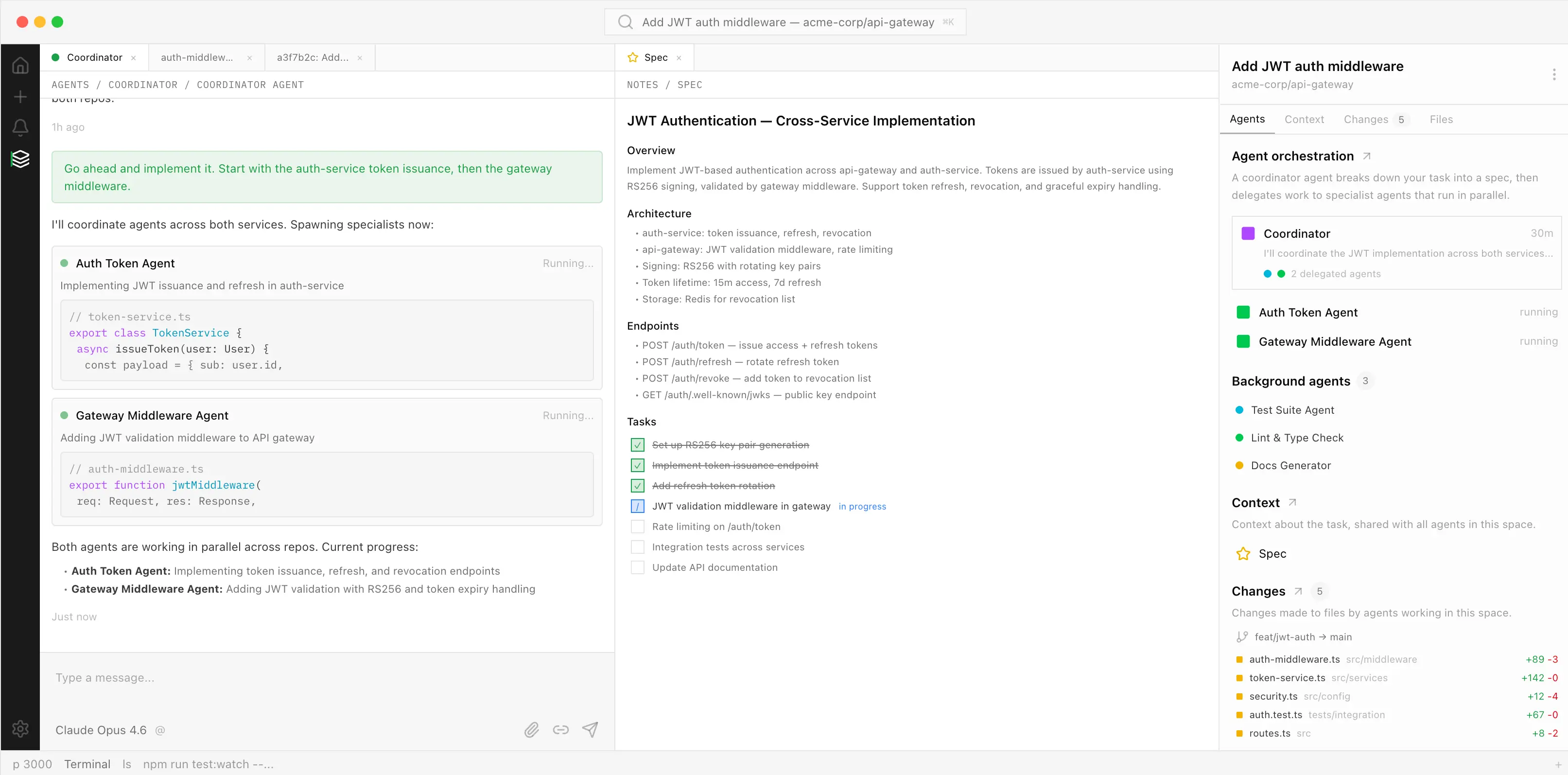 它的模式是这样的:你给一个 intent spec,AI 拆解成多个 agent 并行工作。Auth Token Agent 做认证模块,Gateway Middleware Agent 做网关验证,两个 agent 共享同一个规格文档,各自实现自己的部分,最后串起来。
