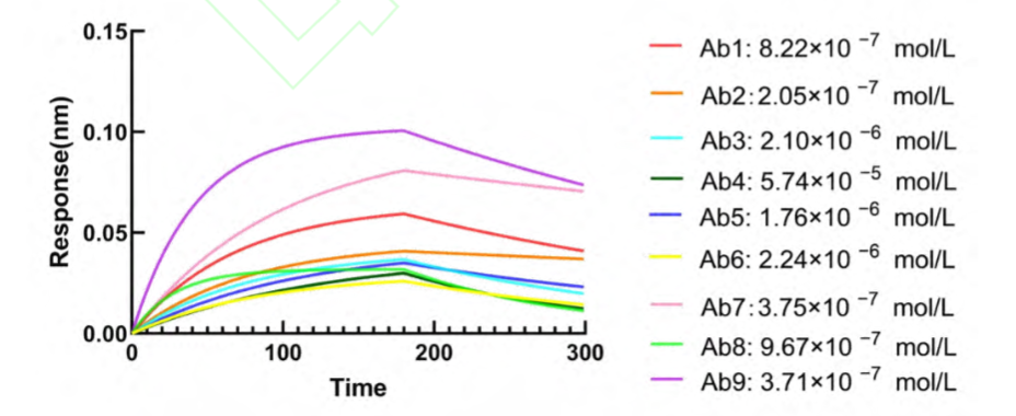 在此基础上,以纯化蛋白免疫BALB/c小鼠,通过细胞融合、HAT筛选、有限稀释法克隆,最终获得9株稳定分泌I177L单抗的杂交瘤细胞株。间接ELISA检测显示,其中6株单抗效价达1:128,000以上。进一步利用Octet®-R2分子互作系统分析,发现2号、9号、7号等单抗与灭活ASFV的亲和力达10⁻⁷ mol/L级别,具备极佳的特异性与结合稳定性。