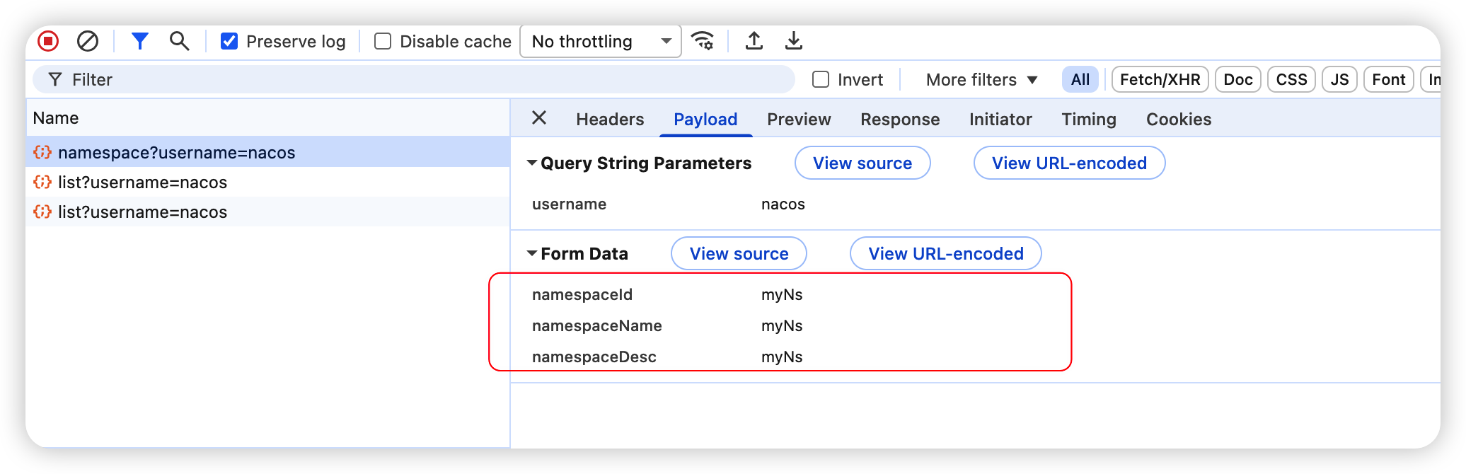 提交完成后,页面的网络请求查询命名空间列表,里面出现了两次 list 请求,这么明显的 Bug ,都能发布!