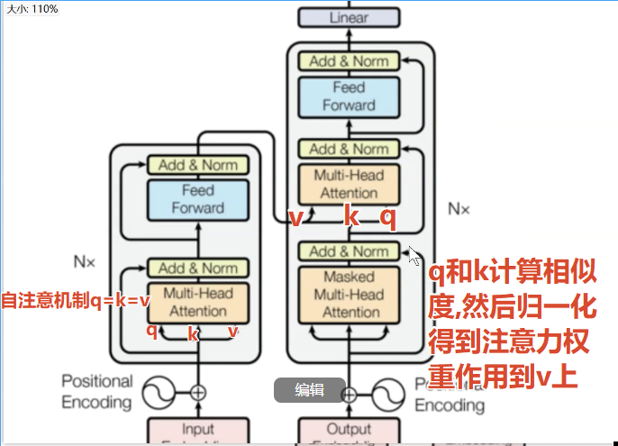 理解二:q、k计算注意力分数,然后使用归一化得到注意力权重,作用到v上(中间语义张量c分配权重)