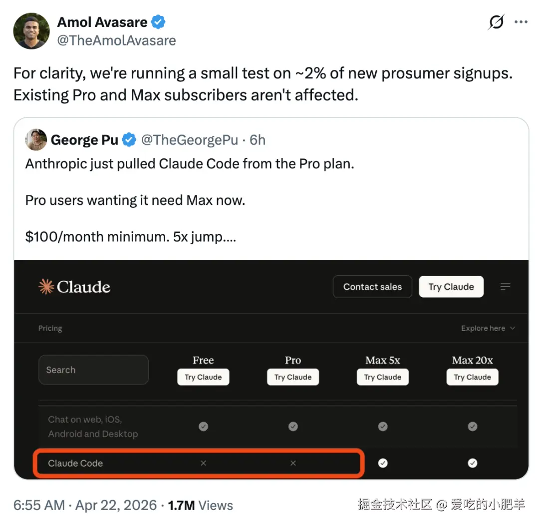 事情闹大之后,Anthropic 的增长主管Amol Avasare 跑出来发推灭火。
