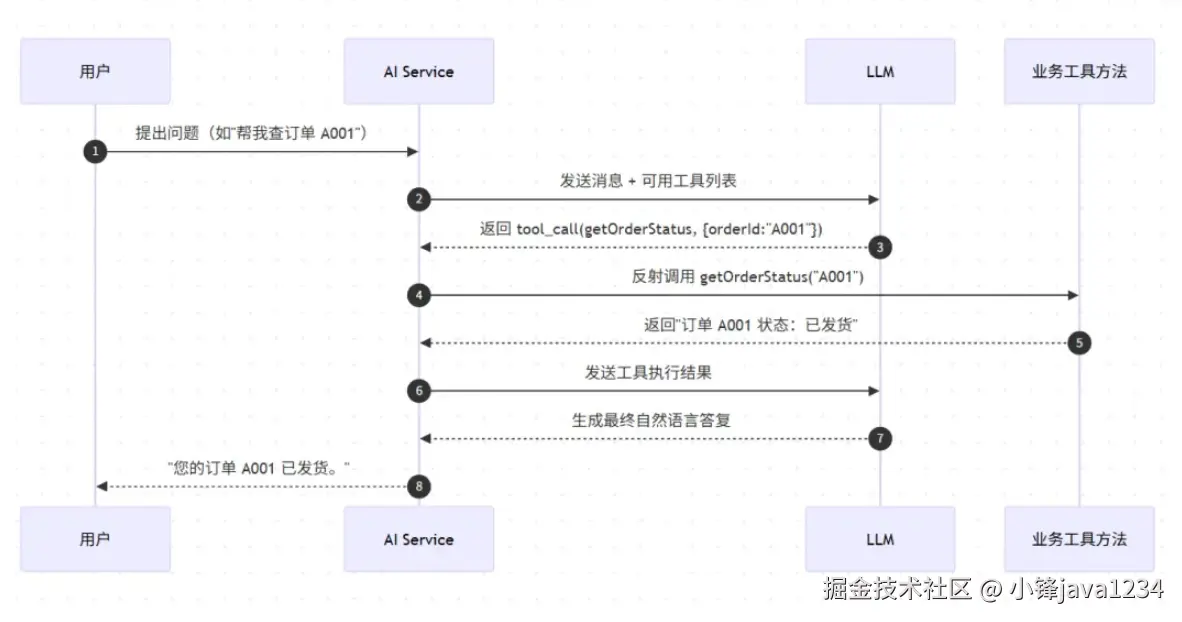 我们把前面讲到的所有核心概念揉到一起,看看当你调用一个 AI Service 方法时,框架内部到底发生了什么: