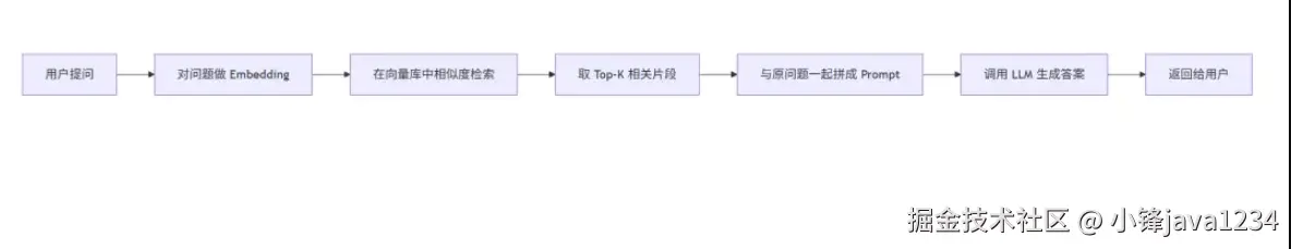 两条流水线共享同一个 Embedding 模型和同一个向量库------这是图中那条虚线想表达的重点。如果两端用的向量化方式不一致,检索效果会直接崩掉,这是很多人做 RAG 常踩的坑。