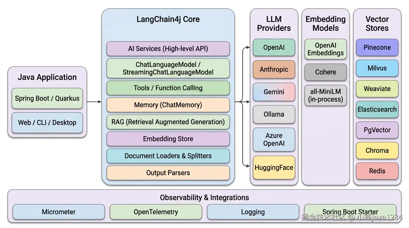 ChatLanguageModel、EmbeddingModel、EmbeddingStore这种清晰的接口做抽象; - 用 Spring Boot Starter / Quarkus Extension 原生接入 IoC 容器。