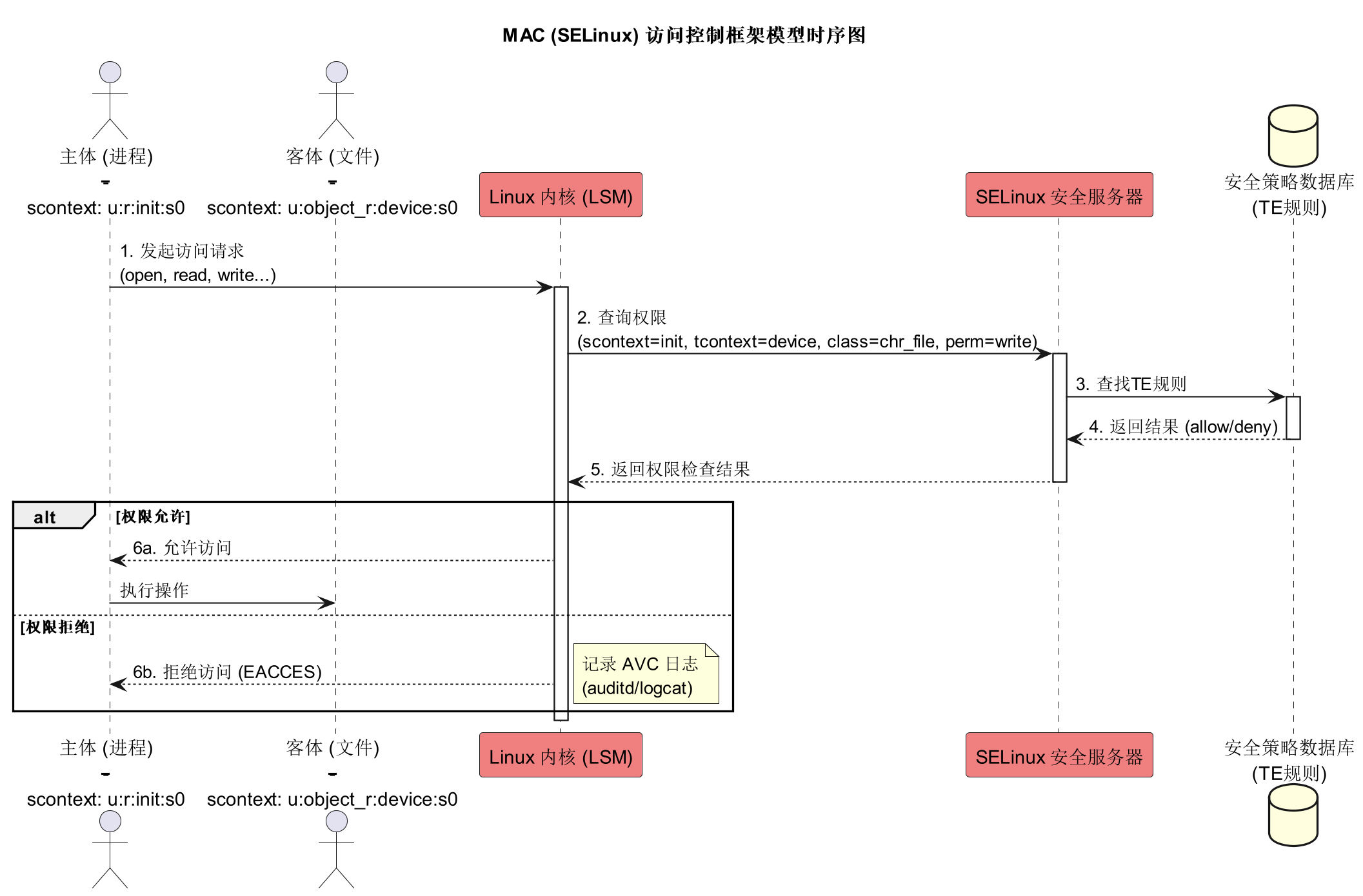 init域的进程)通过系统调用(如open)请求访问客体(一个类型为device的字符设备文件)。 - 拦截并查询 :系统调用穿过 Linux 内核的 VFS 层,最终触发了 LSM (Linux Security Modules) 的钩子函数。LSM 调用 SELinux 安全服务器 (Security Server) 进行权限裁决。