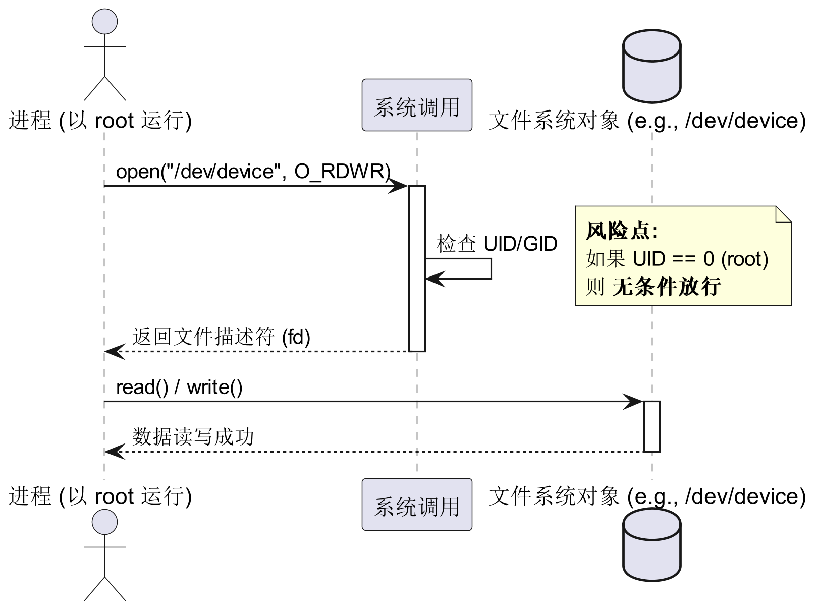 下面这张时序图清晰地描绘了当一个 root 进程尝试访问一个设备文件时,DAC 是如何"放行"的。