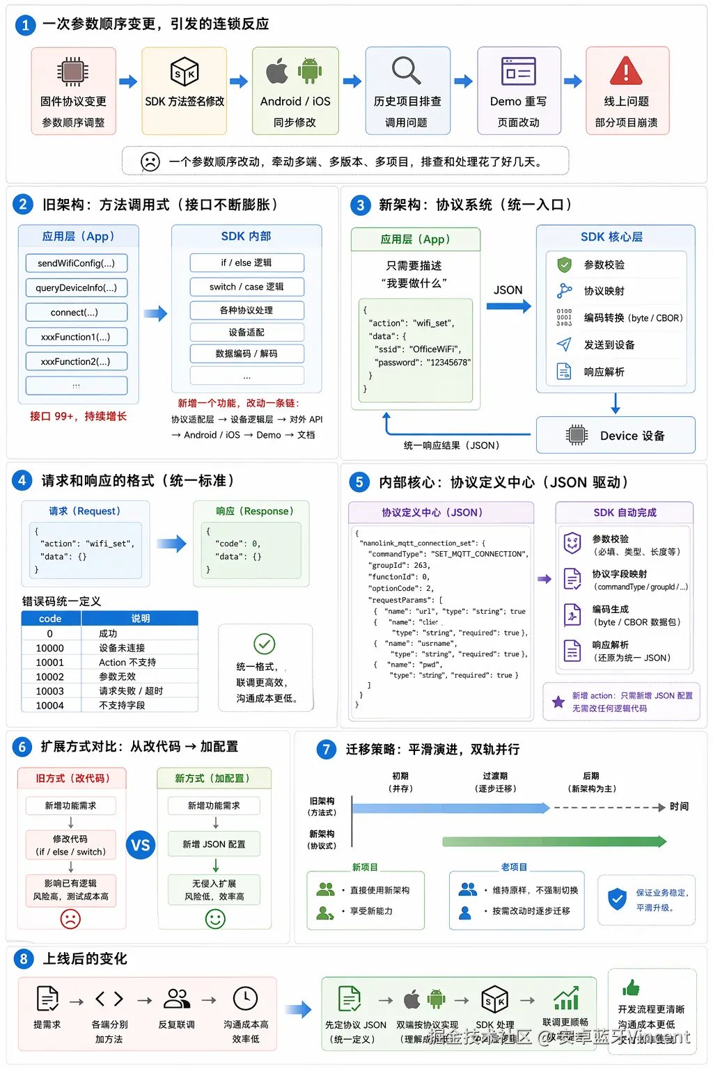 于是 SDK 对外接口涨到了 99+,而且没有停的迹象。每次新增功能,要改的地方是一条链:协议适配层、设备逻辑层、对外 API、Android、iOS、Demo、文档------缺一不可。