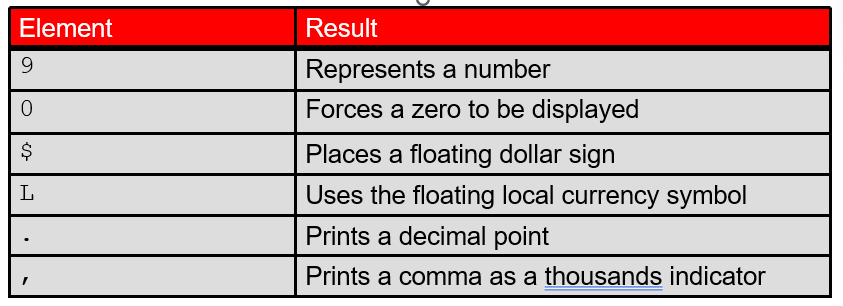 这些是一些可以与TO_CHAR函数一起使用的格式元素,用于将数字值显示为字符: