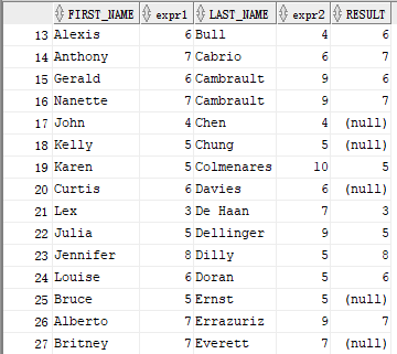 NULLIF(LENGTH(first_name), LENGTH(last_name)) result