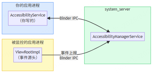 一句话理解:system_server 是中间人,它既是被监控应用的"事件收件箱",也是你的 Service 的"事件邮差"。你和被监控的应用永远不会直接对话。