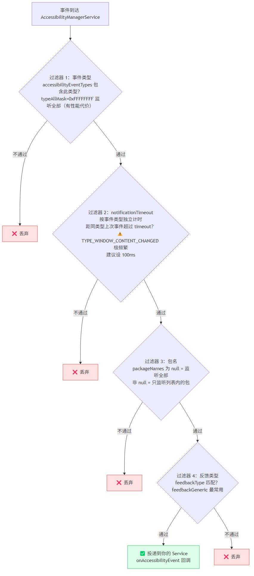 - 四层过滤:事件类型、notificationTimeout(按类型独立计时)、包名、反馈类型,任意一层不过就收不到