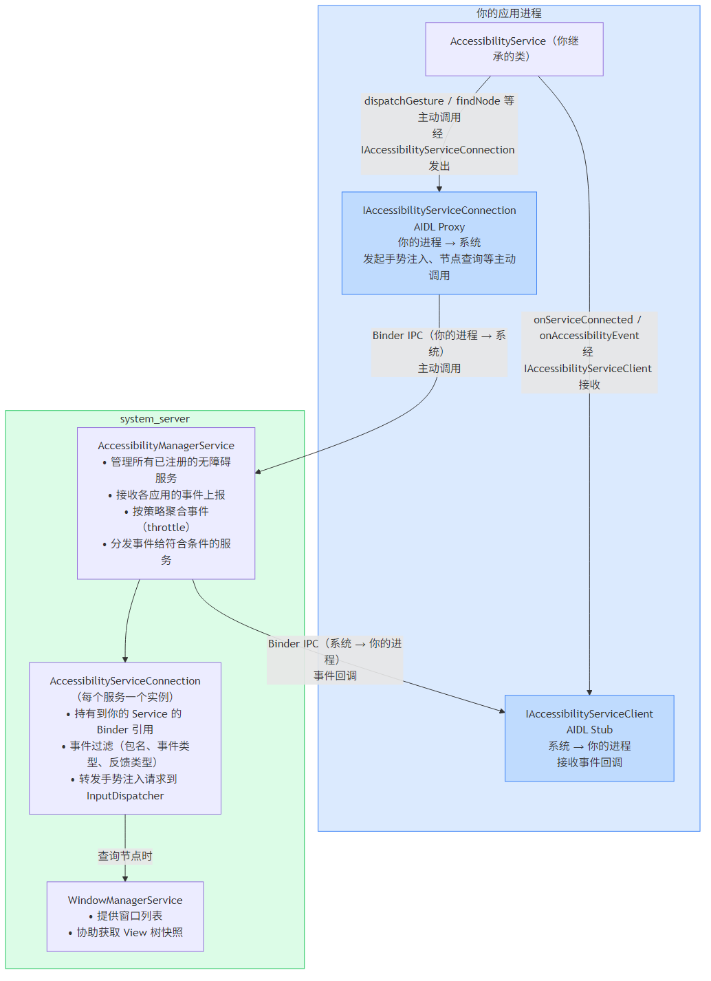 | 你的应用进程 | 运行你写的 AccessibilityService,处理事件、执行操作 | AccessibilityService(你继承) |