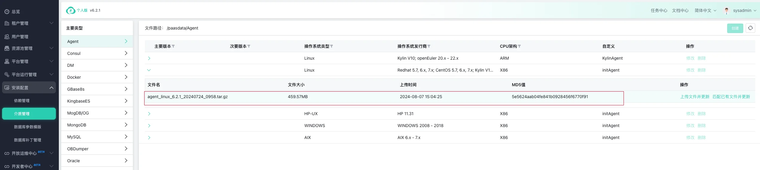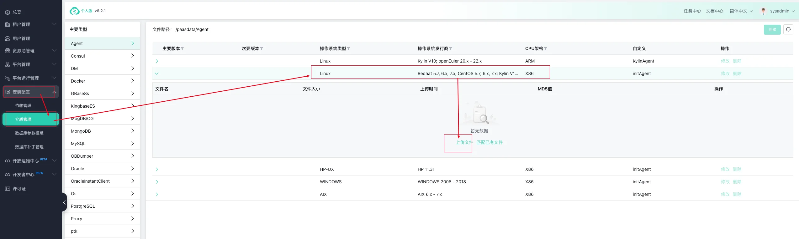 下载后将 agent_linux_6.2.1_20240724_0958.tar.gz 文件上传到网页端: