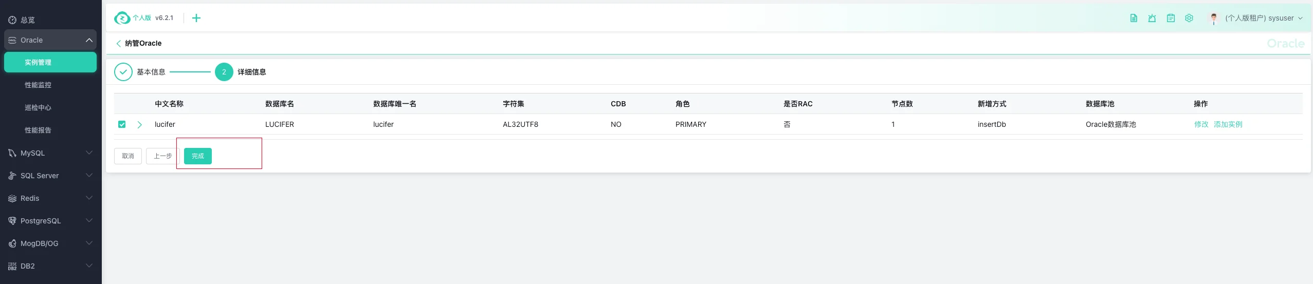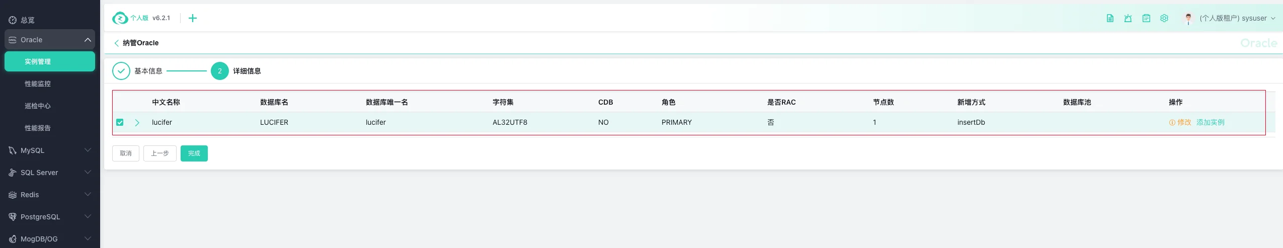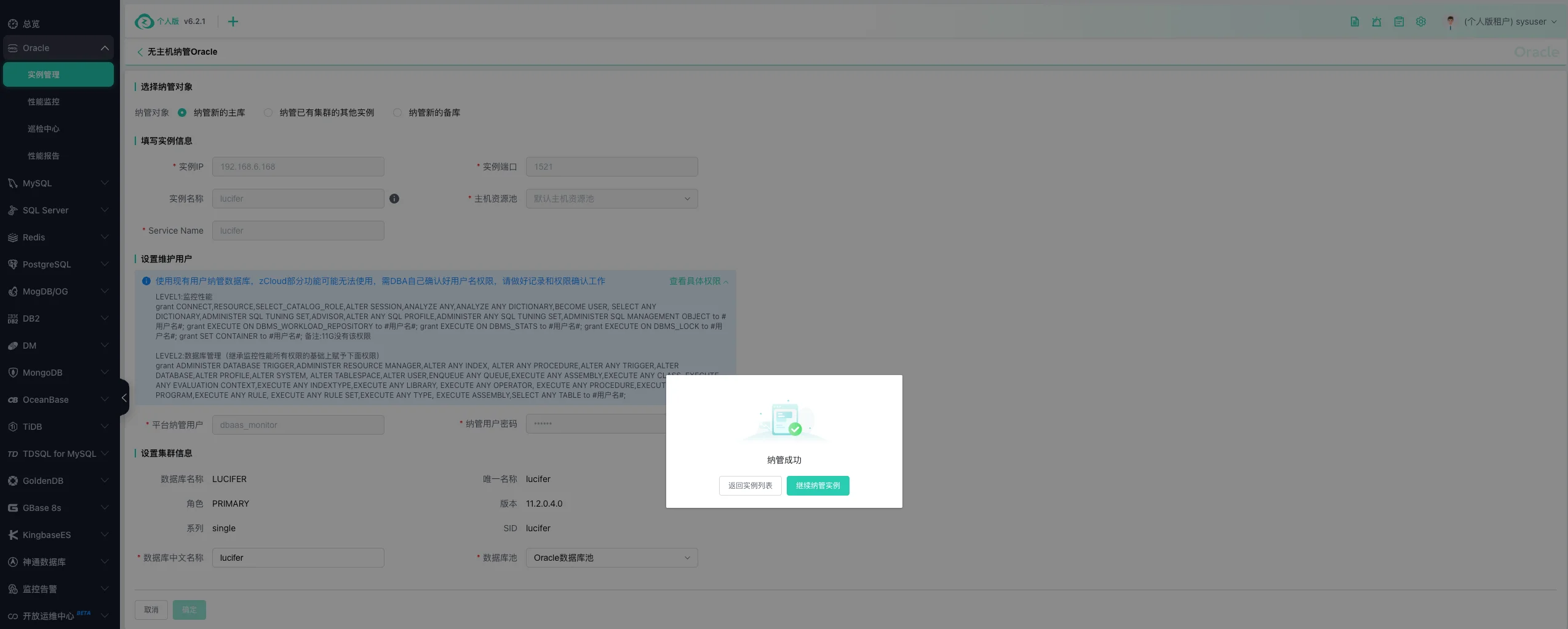 Oracle 数据库纳管完成: