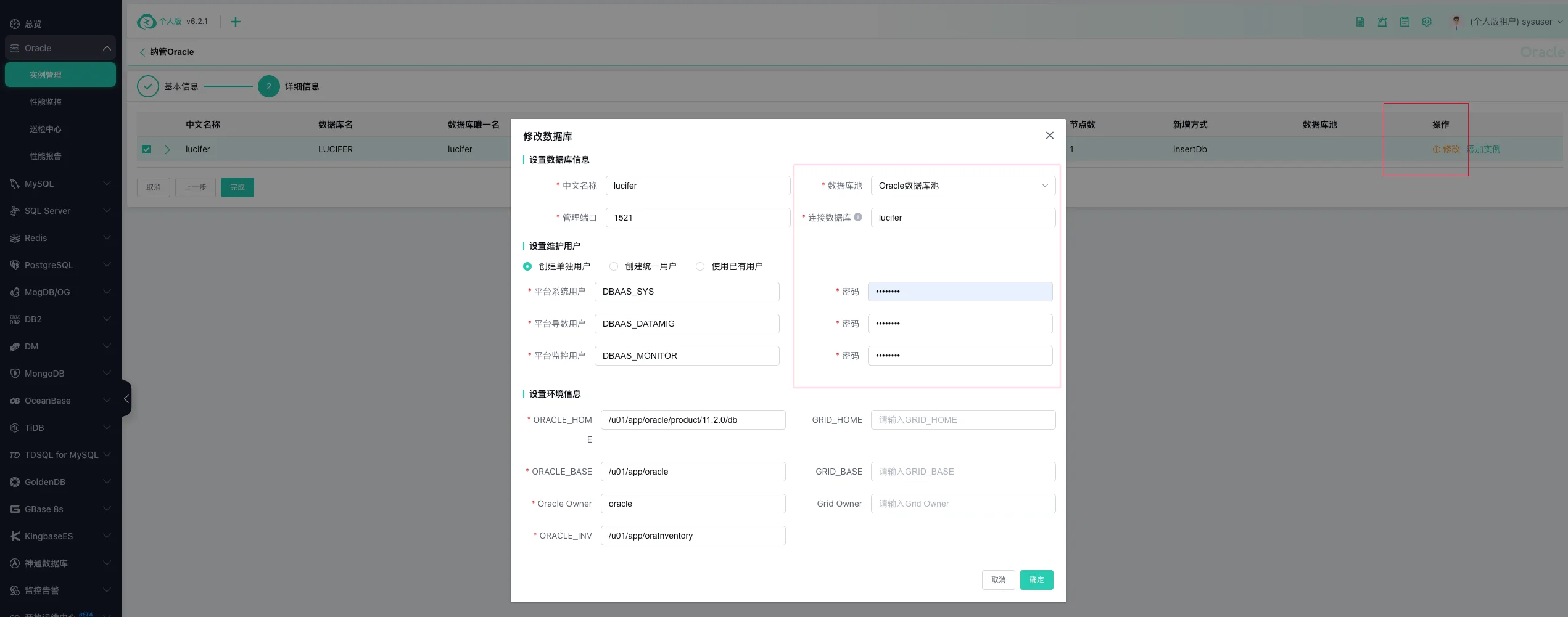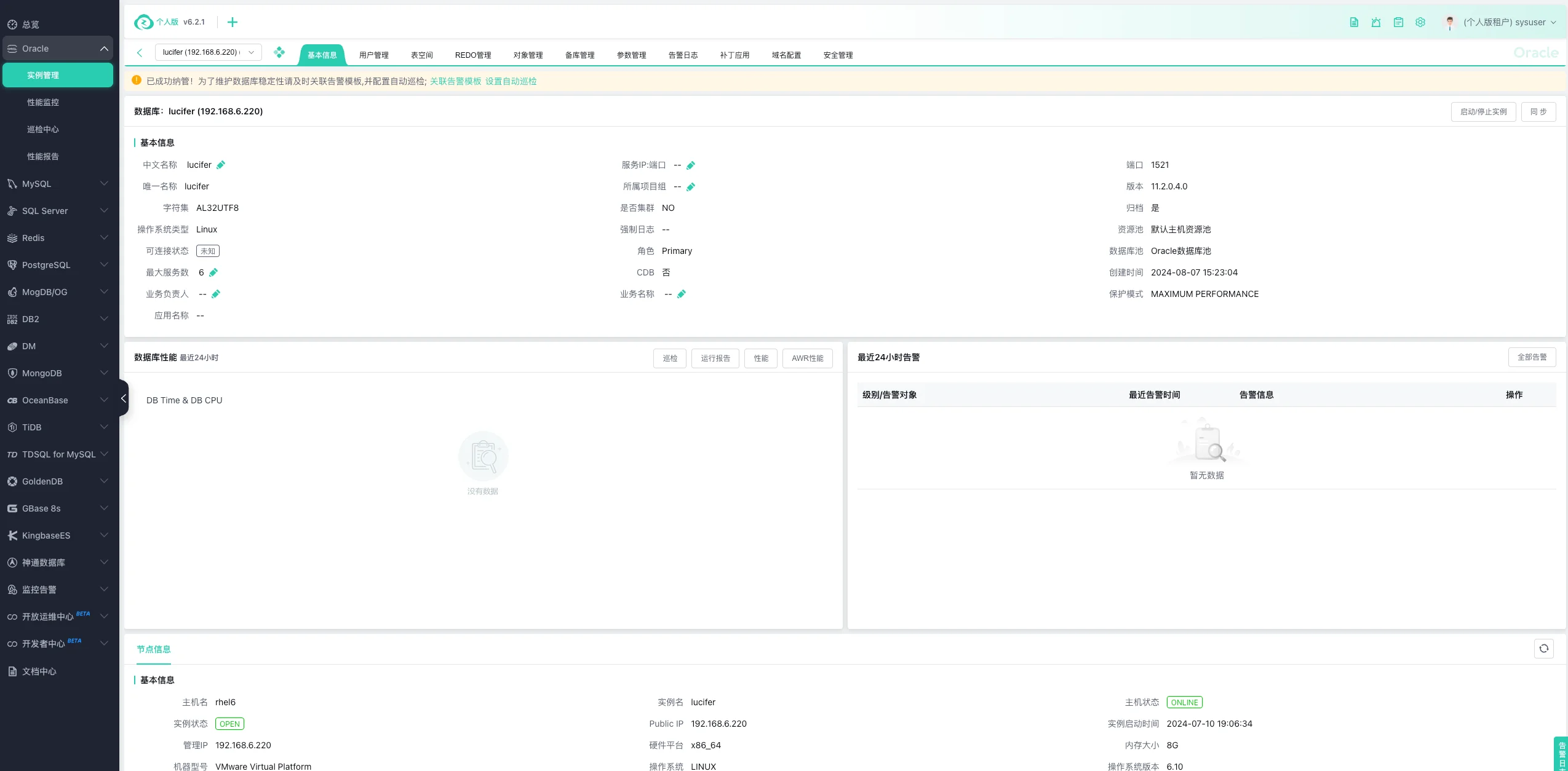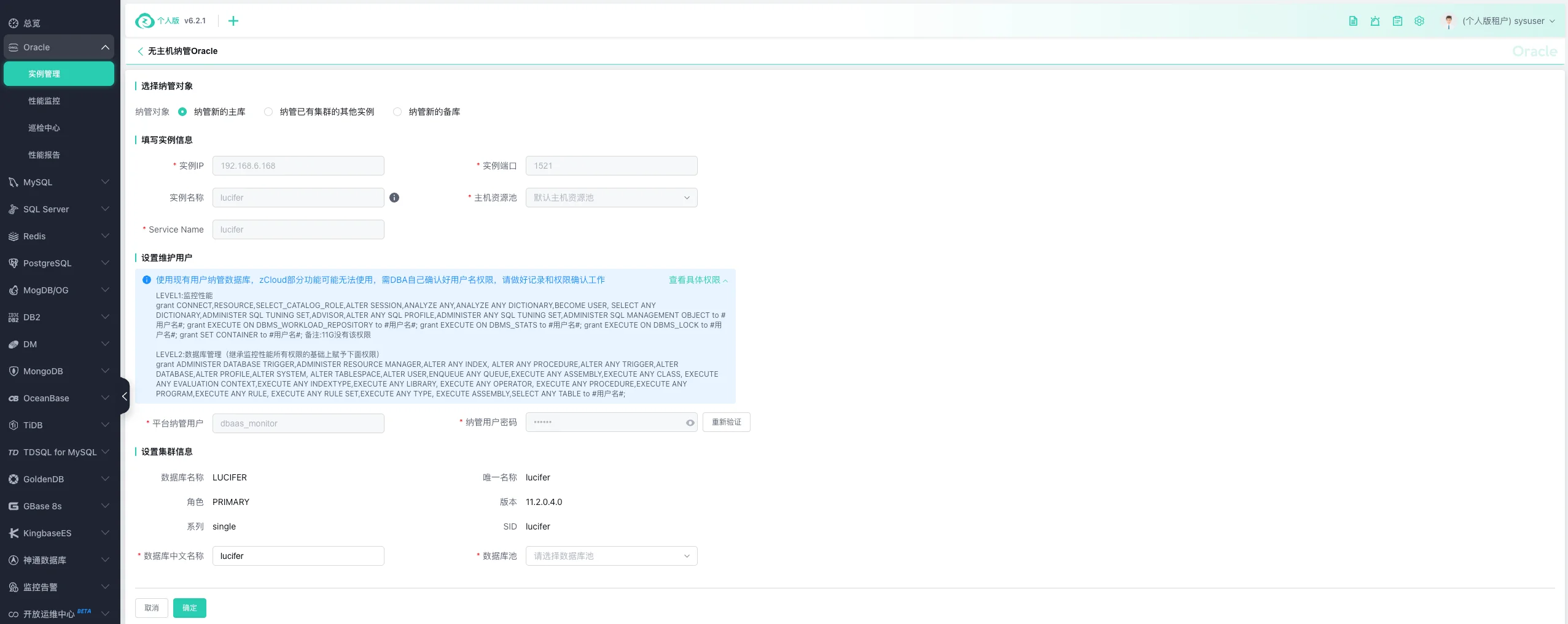 Oracle 数据库纳管完成: