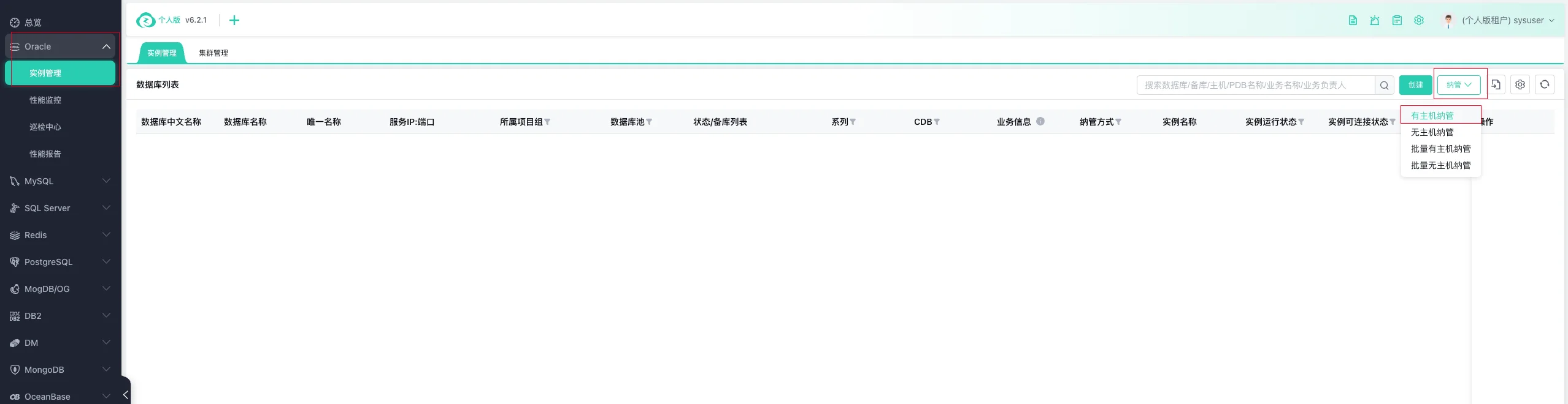 选择【Oracle】--> 【实例管理】--> 【纳管选项】--> 【有主机纳管】: