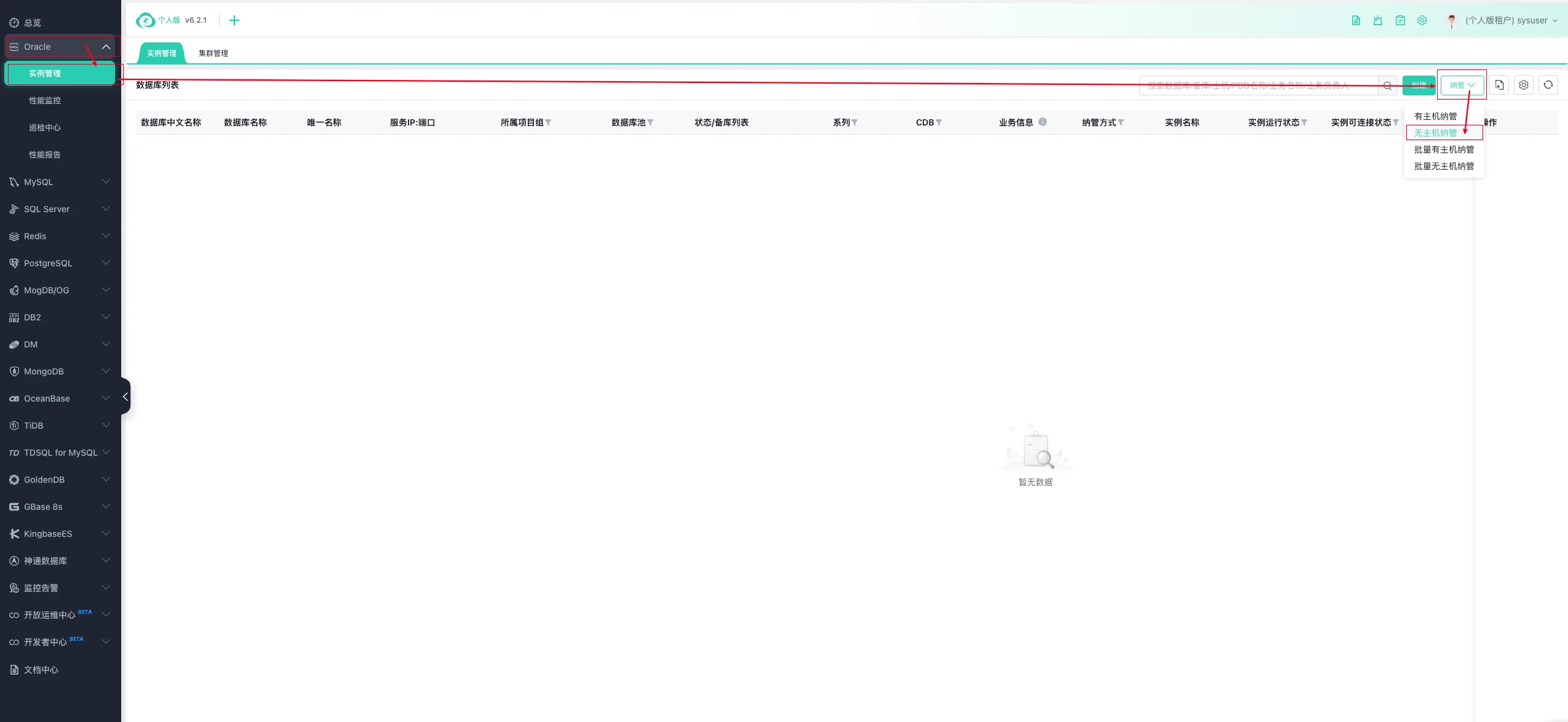 选择【Oracle】--> 【实例管理】--> 【纳管选项】--> 【无主机纳管】:
