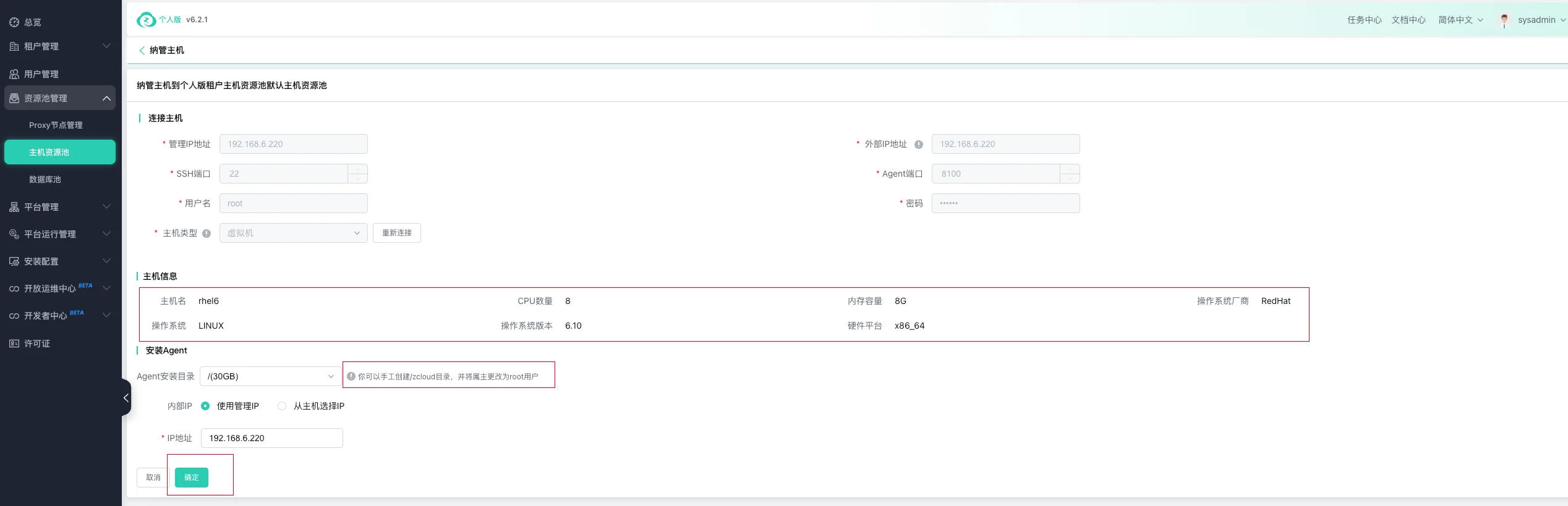 点击验证通过后,选择对应资源池,确定即可: