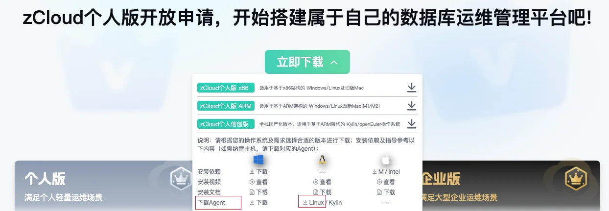 纳管主机需要下载对应平台的 Agent 上传到 zCloud 网页端,这里我选择的是 Linux 主机,所以下载 Linux 的 Agent: