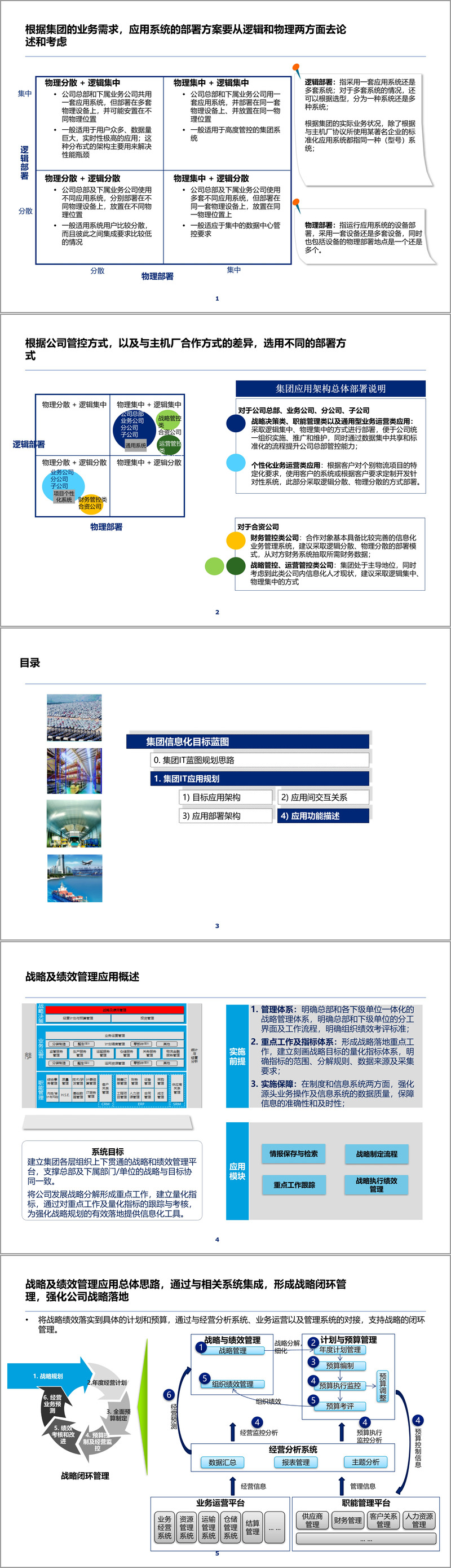 方案对每个核心应用系统都进行了详细的功能描述。从战略及绩效管理、经营计划与预算管理、投资管理等战略层系统,到业务运营管理、计划调度管理、运输管理、仓储管理等运营层系统,再到财务管理、人力资源管理、采购管理等职能层系统,每个系统都明确了实施前提、系统目标、功能模块和实现价值。