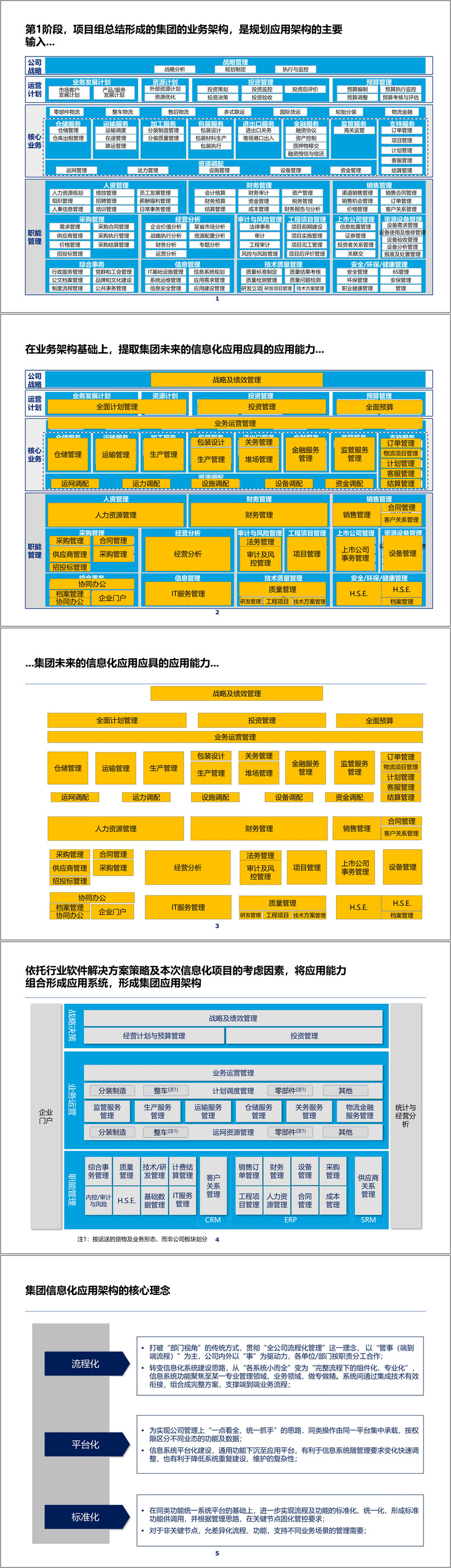 在应用架构规划方面,方案展现了清晰的逻辑脉络。规划团队首先深入分析了集团的业务架构,从战略管理、业务运营到职能支持,全面梳理了各业务领域的能力需求。基于这些业务能力需求,结合行业软件解决方案策略,规划出了集团未来的目标应用架构。这一架构打破了传统的"部门视角",贯彻"全公司流程化管理"理念,实现了从"各系统小而全"到"完整流程下的组件化、专业化"的重要转变。