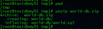 world-db.zip压缩包上传到数据库服务器的/tmp文件夹下,并解压。