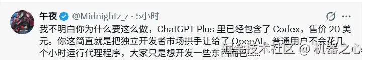 他特别强调, Codex 将继续保留在免费版和 20 美刀的 PLUS 版中。这精准打击了那些因为 Claude 可能取消 Pro 版代码权限而焦虑的开发者。