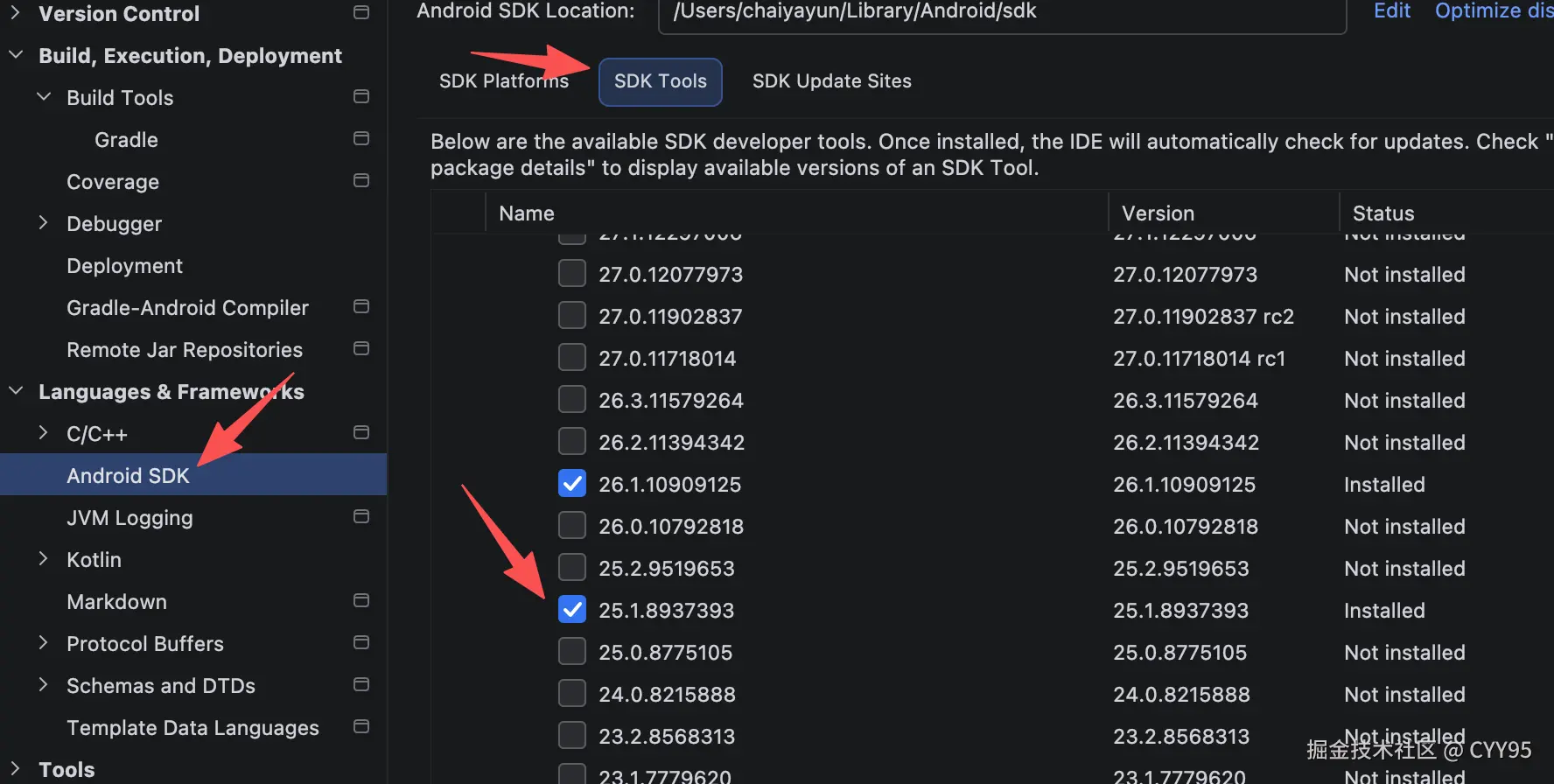 /Users/你的用户名/Library/Android/sdk换成你在第一步记下的 SDK 路径,NDK 的版本号也要换成你实际安装的版本。
