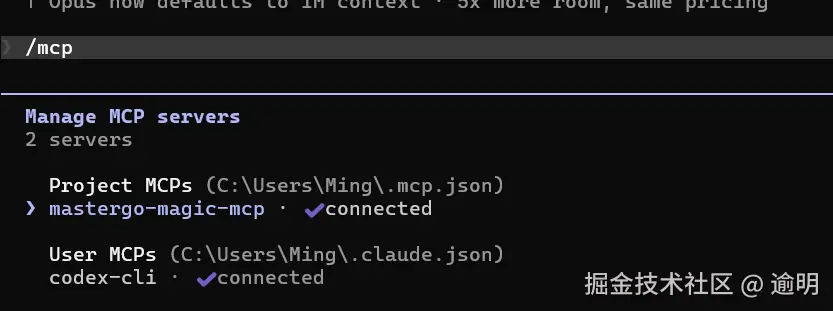 这里可以看到有两种MCP,一个是用户的MCP一个是项目的MCP,这里以项目的MCP为例,可以看到我已经安装了mastergo的MCP服务,我们可以直接在这个路径下找到这个文件,当然如果之前没有安装过MCP的应该是没有这个文件的,直接自己新建一个就行,然后将MCP的配置粘贴进去重启Claude Code就行,然后你再输入/mcp命令就能看到你手动安装的MCP了。