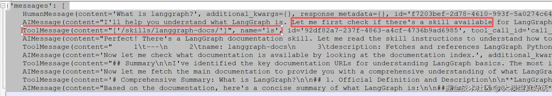 langgraph-docsSkill 的description识别用户意图,然后渐进式加载该 Skill 的完整内容并回答。arduinoresult = agent.invoke( { "messages": [ { "role": "user", "content": "What is langgraph?", } ] }, config={"configurable": {"thread_id": "12345"}}, ) print(result)从执行结果(下图)可以看到,DeepAgents 准确识别了 Skills 并给出了回答。