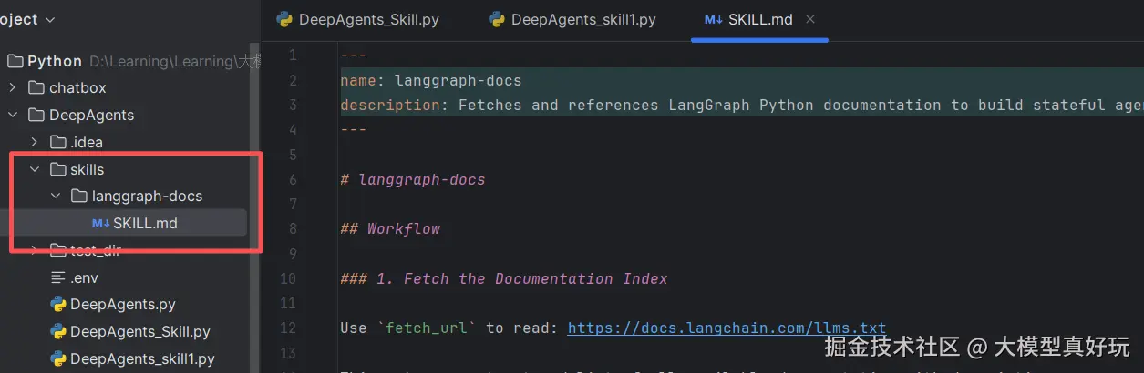 https://github.com/langchain-ai/deepagents/tree/main/libs/cli/examples/skills/langgraph-docs将该 Skill 下载到项目文件夹下的