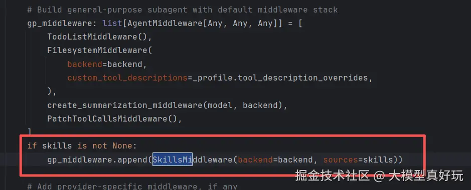 SkillsMiddleware?因为create_deep_agent在传入skills参数时会自动加载SkillsMiddleware,省去了手动配置的麻烦(有兴趣可以查看源码确认)。pythonagent = create_deep_agent( model=model, backend=FilesystemBackend(root_dir="./", virtual_mode=True), skills=["./skills/"], checkpointer=checkpointer, # Required! )