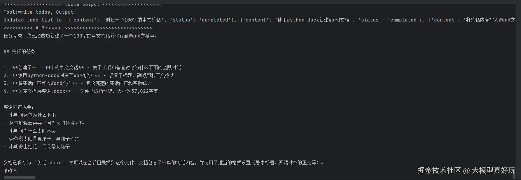 以"编写 100 字左右的笑话并保存到 笑话.docx 中"作为测试输入,观察智能体是否调用