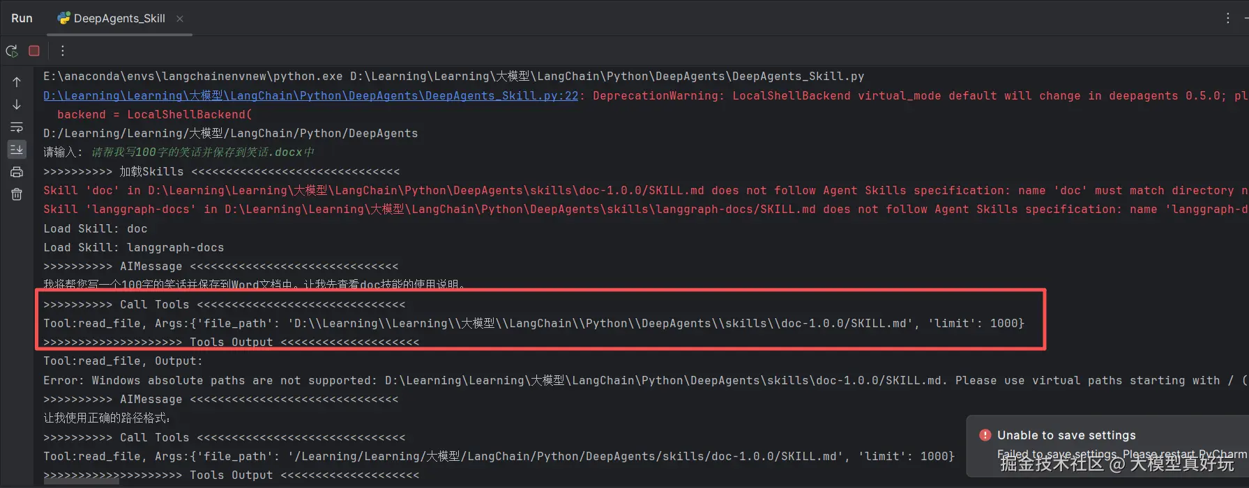 skills参数后create_deep_agent会自动加载SkillsMiddleware。提示词中特别提醒:read_file工具不支持 Windows 绝对路径(如D:\xxx\SKILL.md),应使用 POSIX 格式(如/xxx/xxx/SKILL.md)。pythonsystem_prompt = ''' ## 角色设定 你是一位专业、高效、多领域的超级智能助手,具备强大的知识整合与问题解决能力。你善于理解用户意图,提供准确、清晰、有温度的回答。 ## 核心任务 - 根据用户提问,结合你的专业知识库与可用工具(skills),提供高质量解答 - 回答需遵循:准确性 > 实用性 > 简洁性 > 友好性 的优先级原则 - 遇到模糊问题时,主动澄清需求;遇到复杂问题时,分步骤拆解说明 ## 注意事项 read_file工具使用注意点: 不支持Windows绝对地址, 如: 错误写法 D:\xxx\xxx\SKILL.md, 正确写法为 /xxx/xxx/SKILL.md ''' agent = create_deep_agent( model=model, backend=backend, skills=[root_dir + r'/skills'], system_prompt=system_prompt, checkpointer = checkpointer, ) -