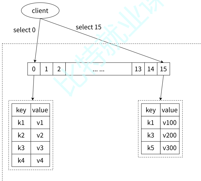 Redis 只是用数字作为多个数据库的实现。Redis 默认配置中是有 16 个数据库。select 0 操作会切换到第一个数据库,select 15 会切换到最后一个数据库。0 号数据库和 15 号数据库保存的数据是完全不冲突的,即各种有各自的键值对。默认情况下,我 们处于数据库 0。