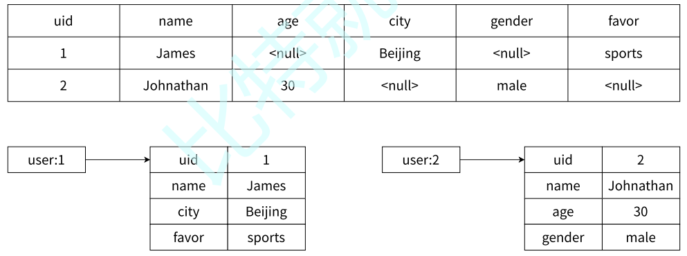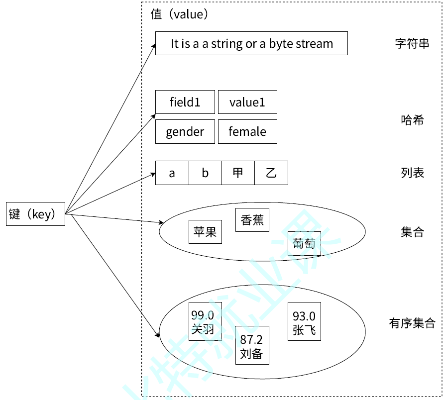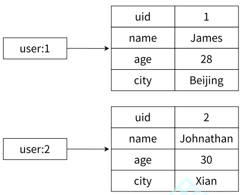O(1) | key 所存储的值的类型 可能的返回值: • string(字符串) • list(列表) • set(集合) • zset(有序集合) • hash(哈希) • stream(流) • none(key 不存在) | 返回 key 所存储的值的类型。 | type user:1查看user:1存储的数据类型 |