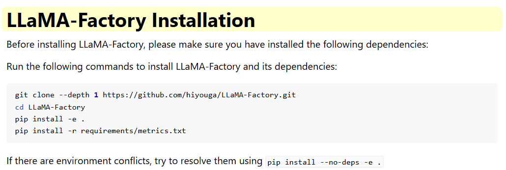 https://llamafactory.readthedocs.io/en/latest/,进到官网,找到installation。