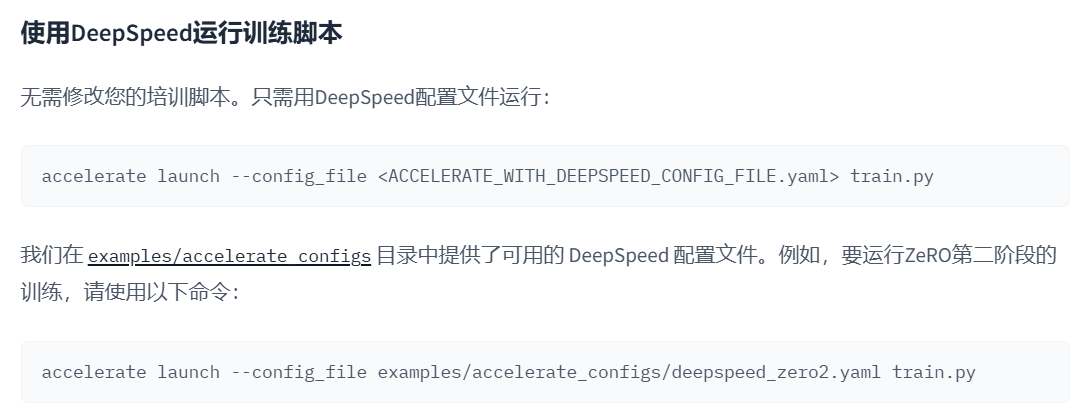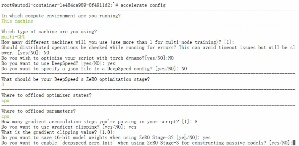 参数配置要先pip accelerate和deepspeed,然后他会通过问答的方式配置常用参数。资源充足从