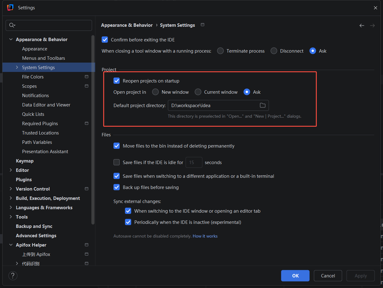 File | Settings | Appearance & Behavior | System Settings | Project