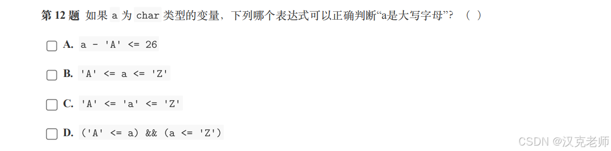 题目:a是char变量,哪个能判断 a 是大写字母?