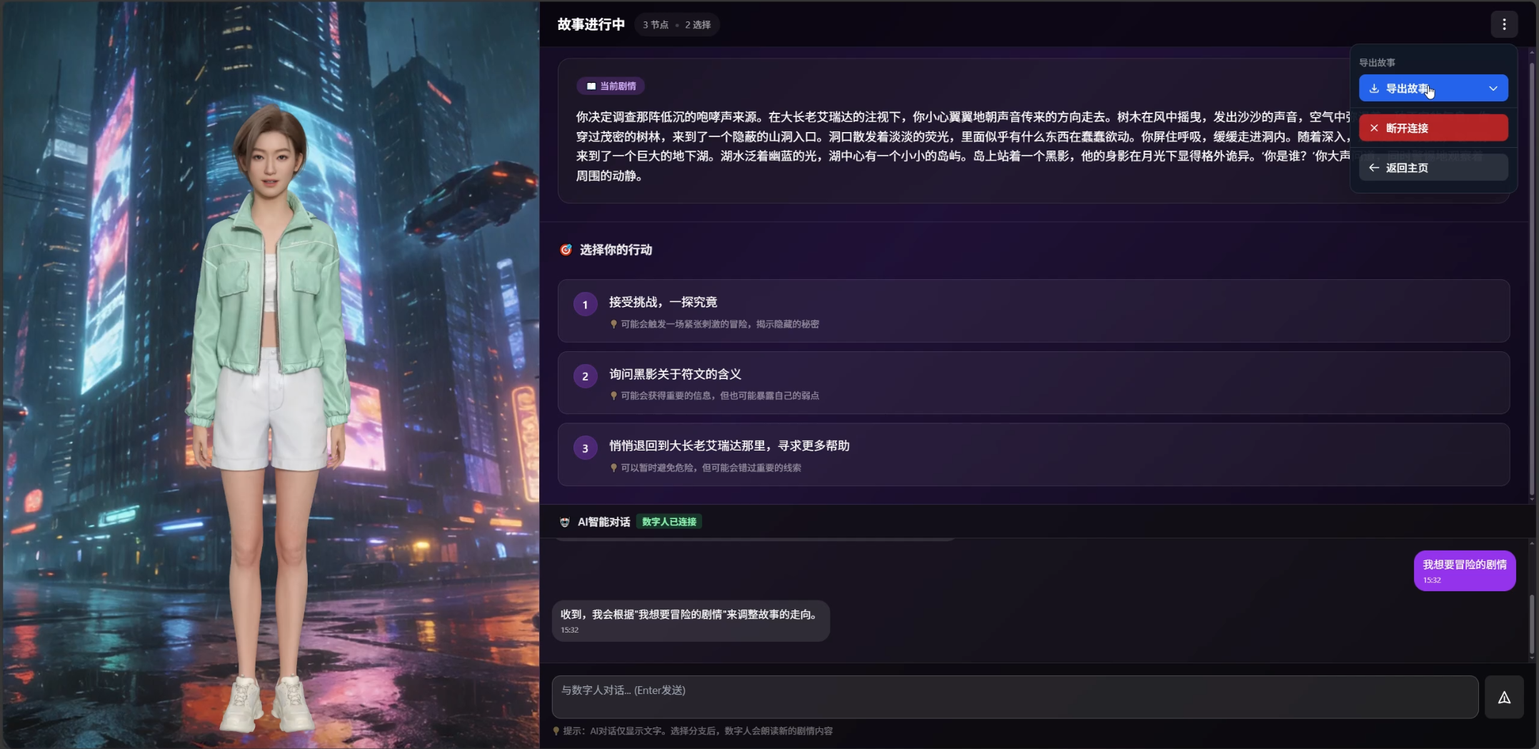 - 左侧:3D数字人实时渲染,配合语音讲述剧情